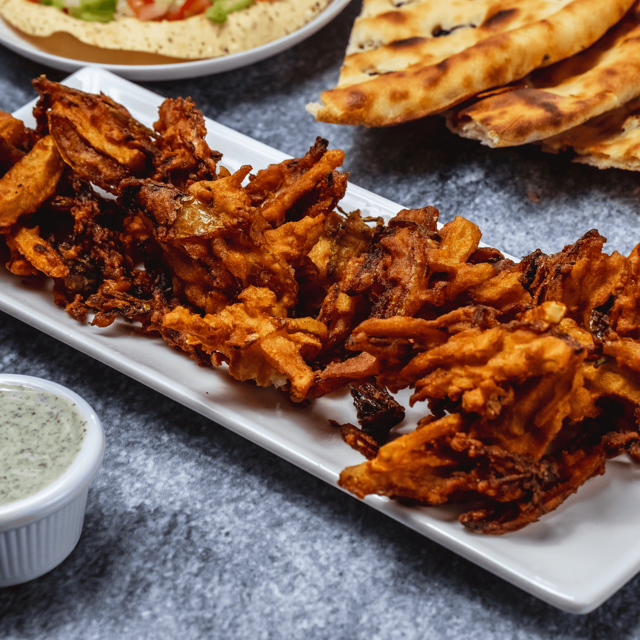 Onion bhaji, also known as onion fritters, is a popular Indian snack made from thinly sliced onions coated in a spiced chickpea flour batter and deep-fried until crispy. Server with mint & tamarind chutney.