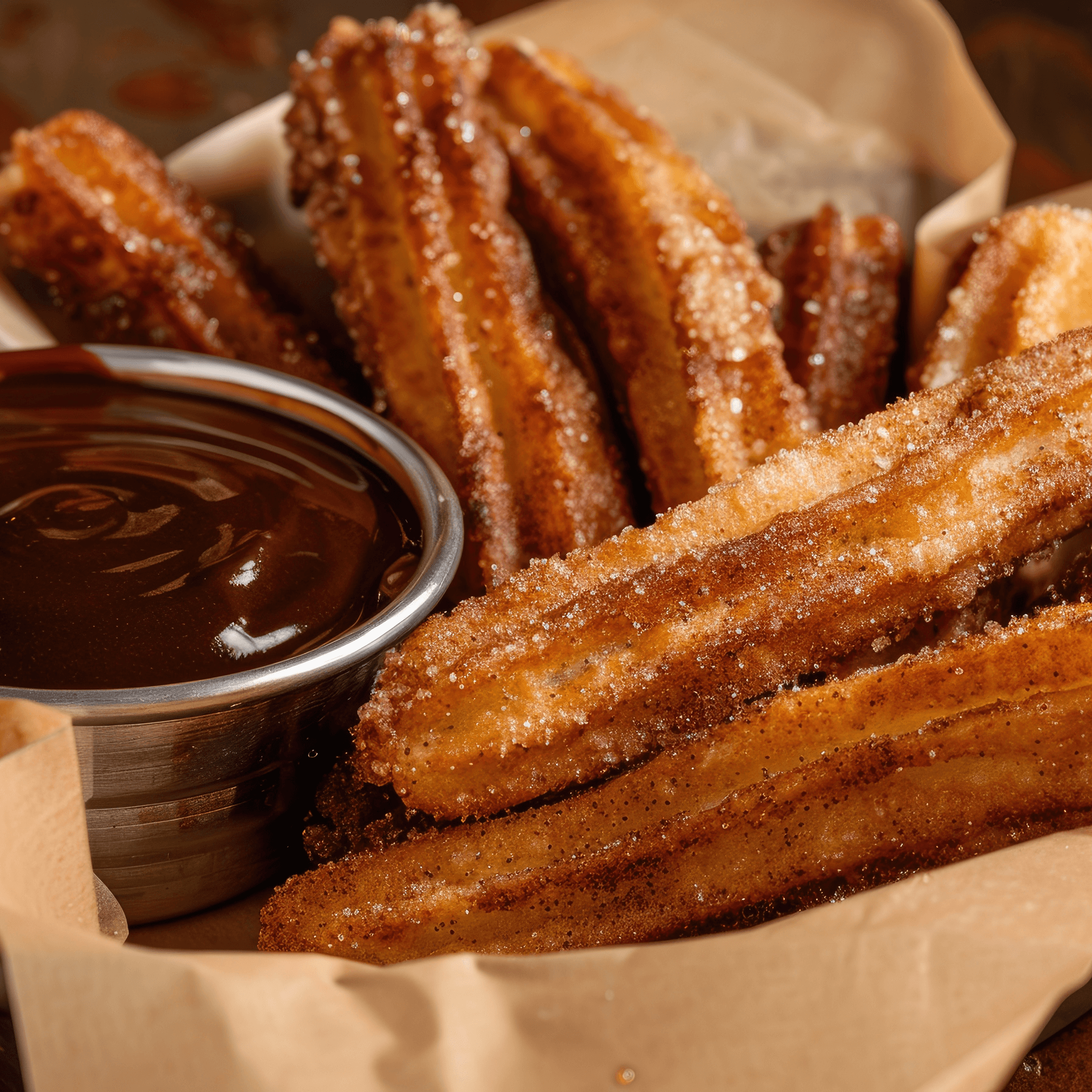 Freshly Baked churros coated in cinnamon sugar, paired with rich, velvety chocolate sauce for dipping.