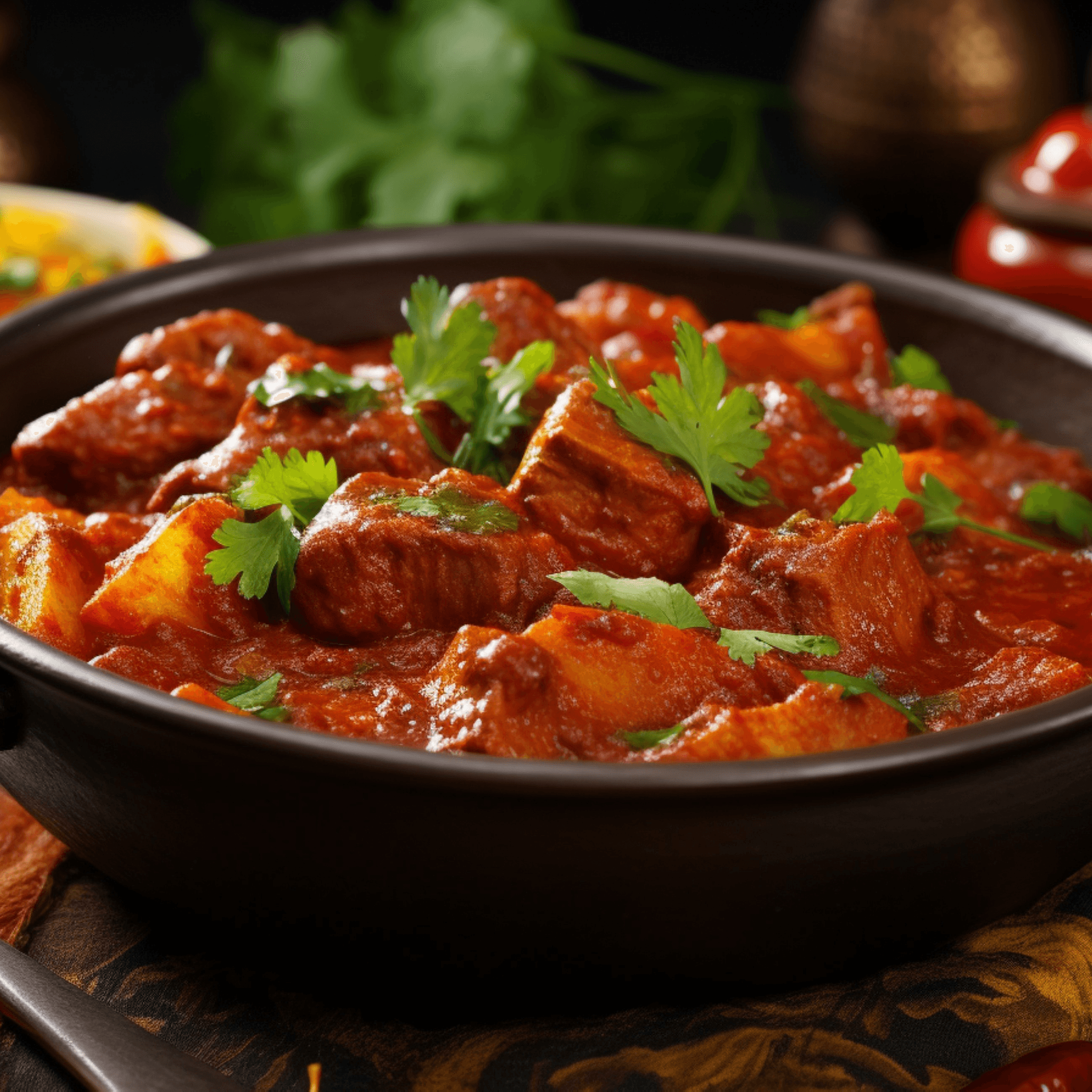 A hearty curry infused with cumin, coriander, turmeric, and a touch of heat-served in a rich, spiced gravy.