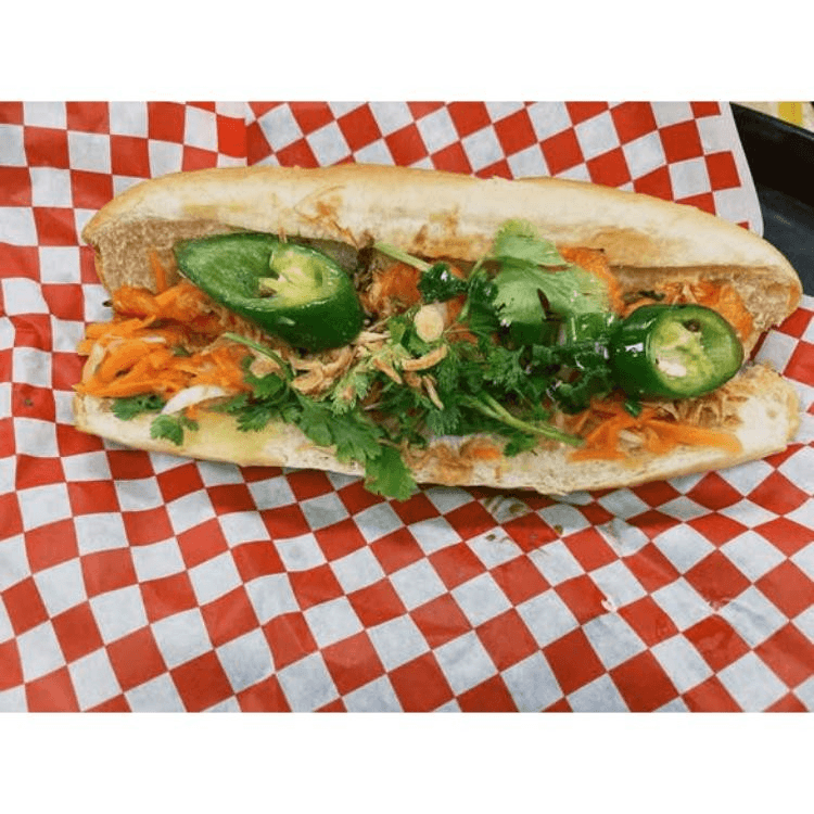 Bánh Mì Gà Nướng. Grilled chicken with pickled carrots, daikon, cilantro, cucumber, jalapeños, and mayonnaise in a baguette