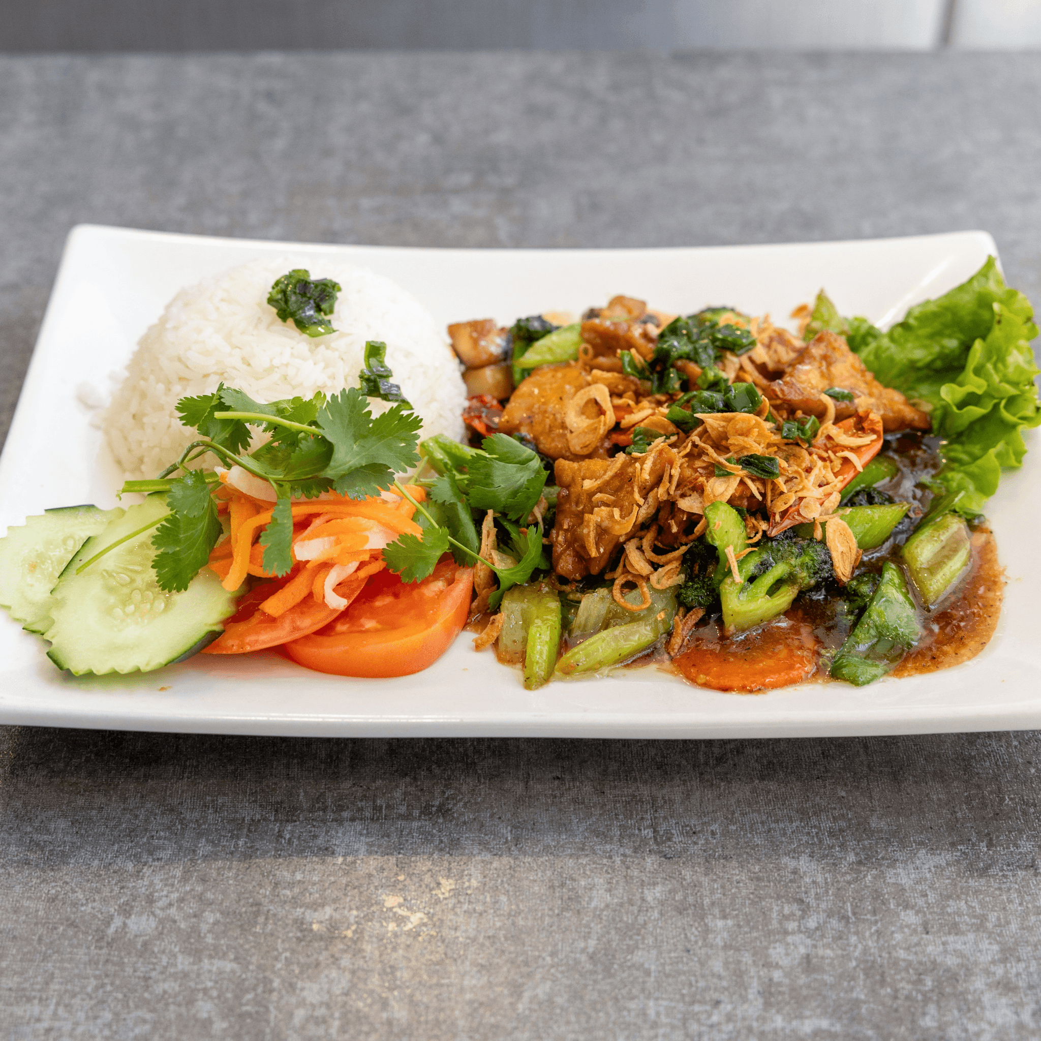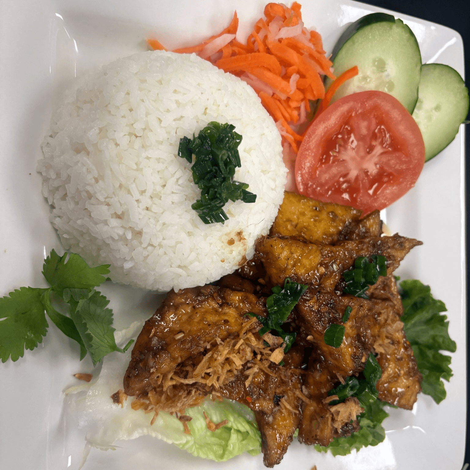 Đậu Hũ Xả Ớt. Crispy tofu with fragrant lemongrass, spicy chili, and fresh vegetables