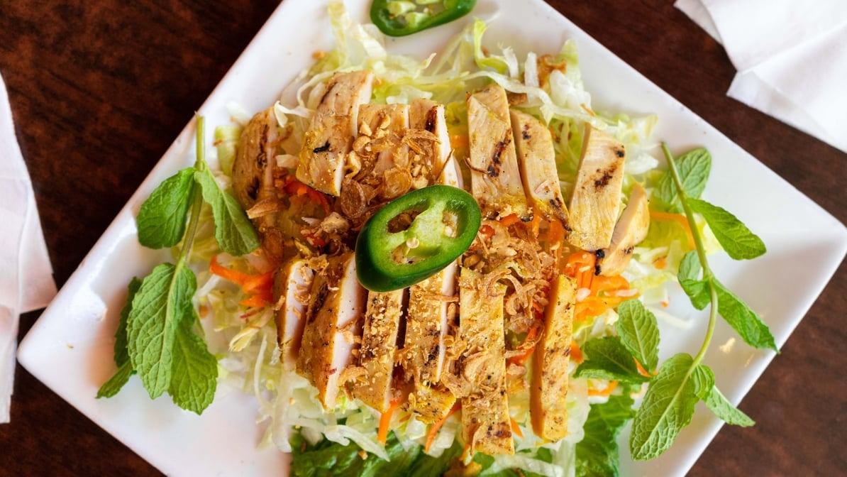 Gỏi Gà Nướng. Grilled chicken with fresh basil, cilantro, shredded cabbage, carrot, daikon, jalapeños, ground peanuts and crispy onion mixed with house special sauce