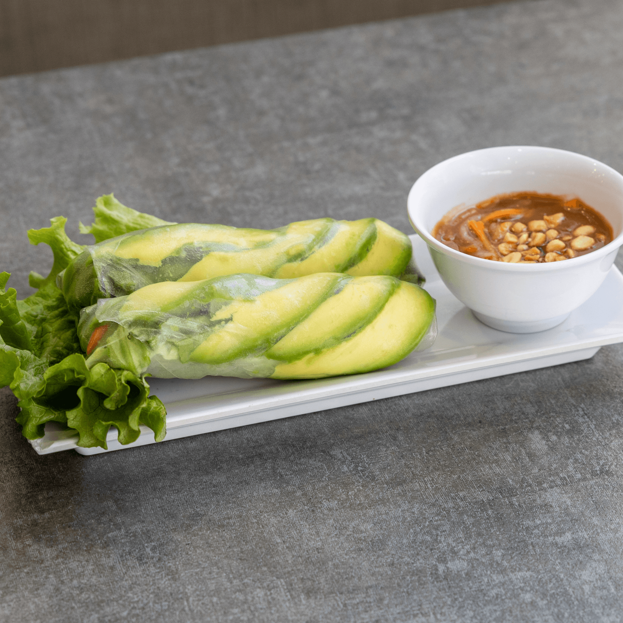 Goi Cuốn Chay. 2 rolls. Avocado, fresh lettuce, cilantro, shredded pickled carrot & daikon and cucumber wrapped in rice paper. Served with homemade peanut sauce