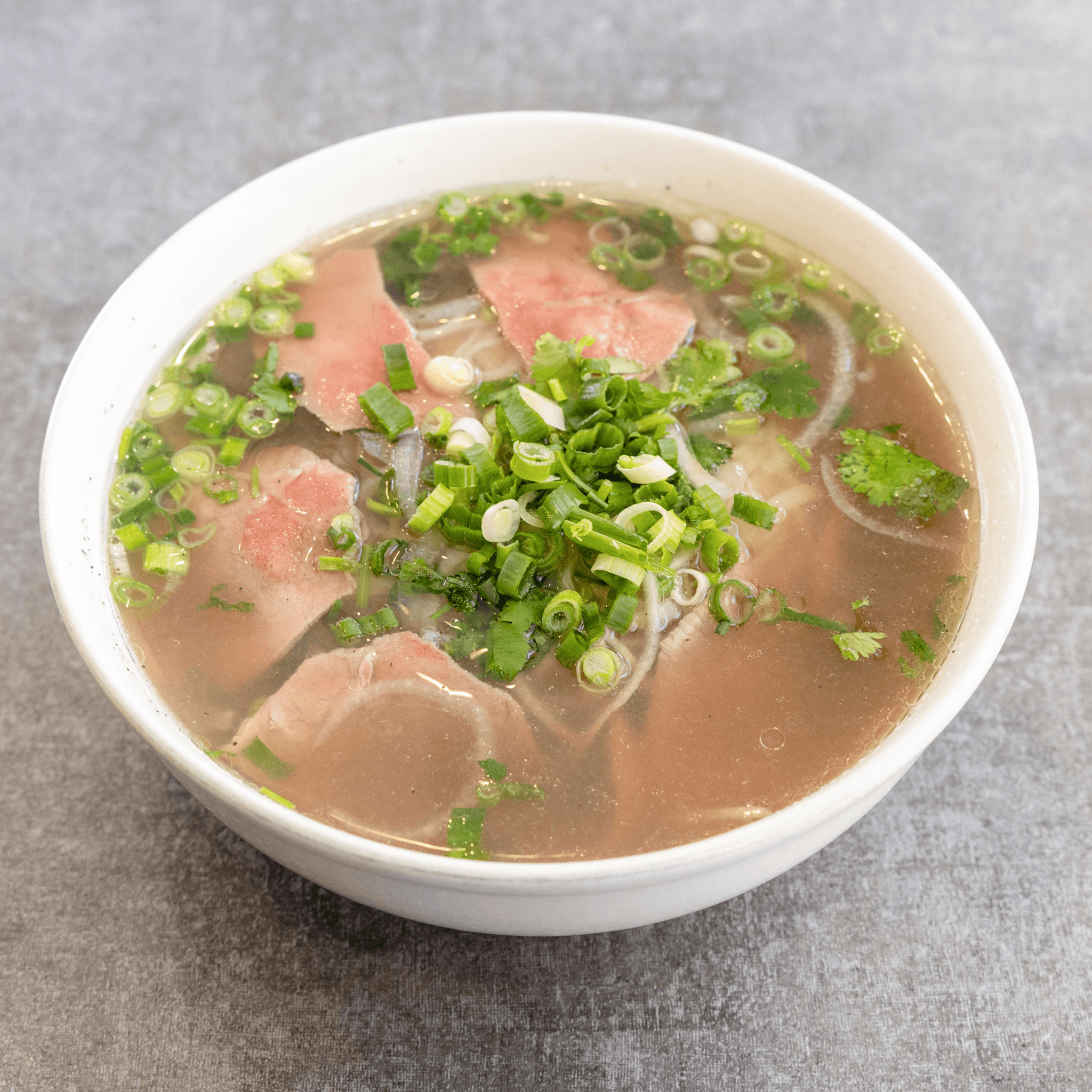 Tái, Chin, Gan. Tender rare steak, well-done brisket, and tendon served in a savory noodle soup. Available in medium or large portions