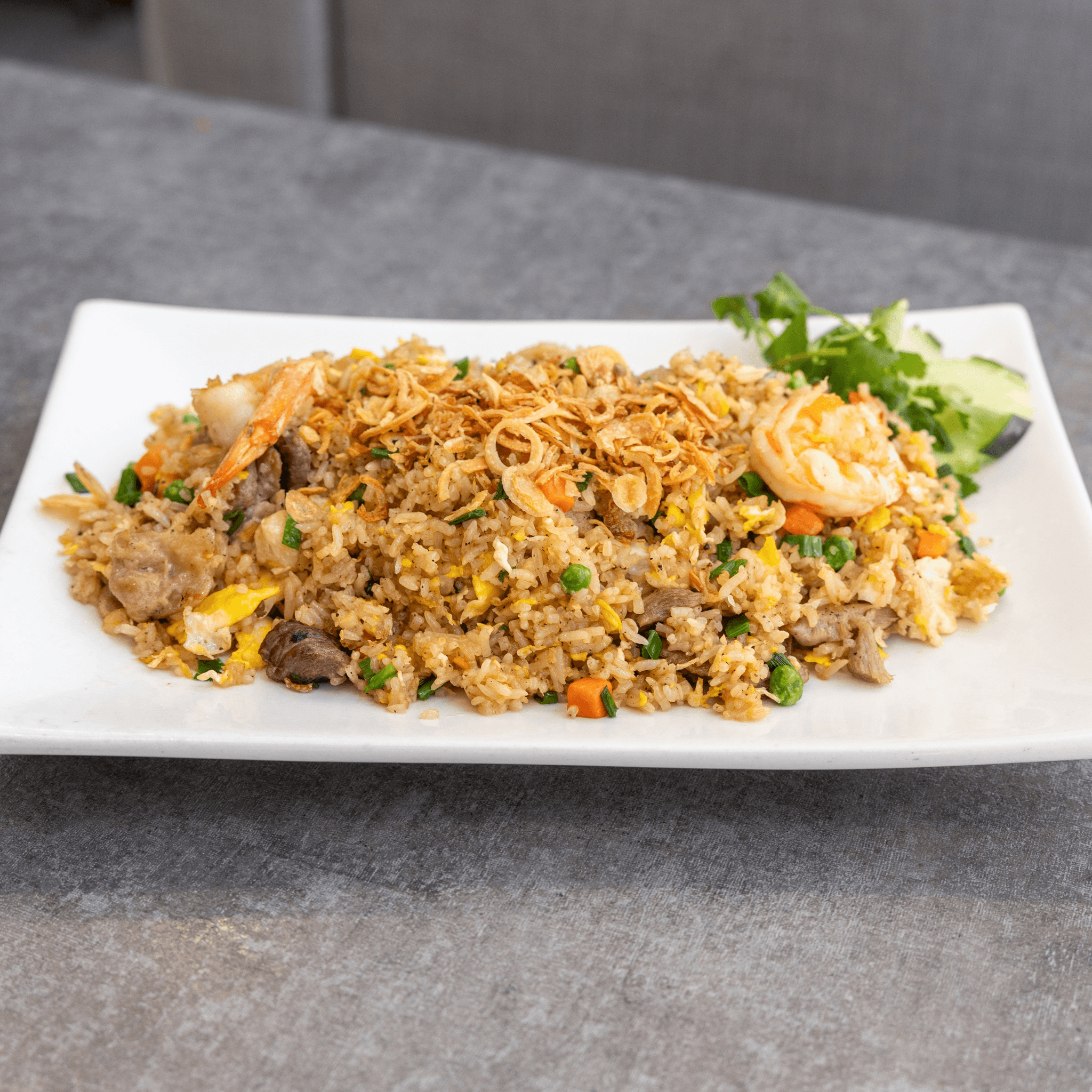 Cơm Chiên Đặc Biệt Or Tôm. Fried rice with a choice of combo or shrimp. Dish served on a steam rice plate