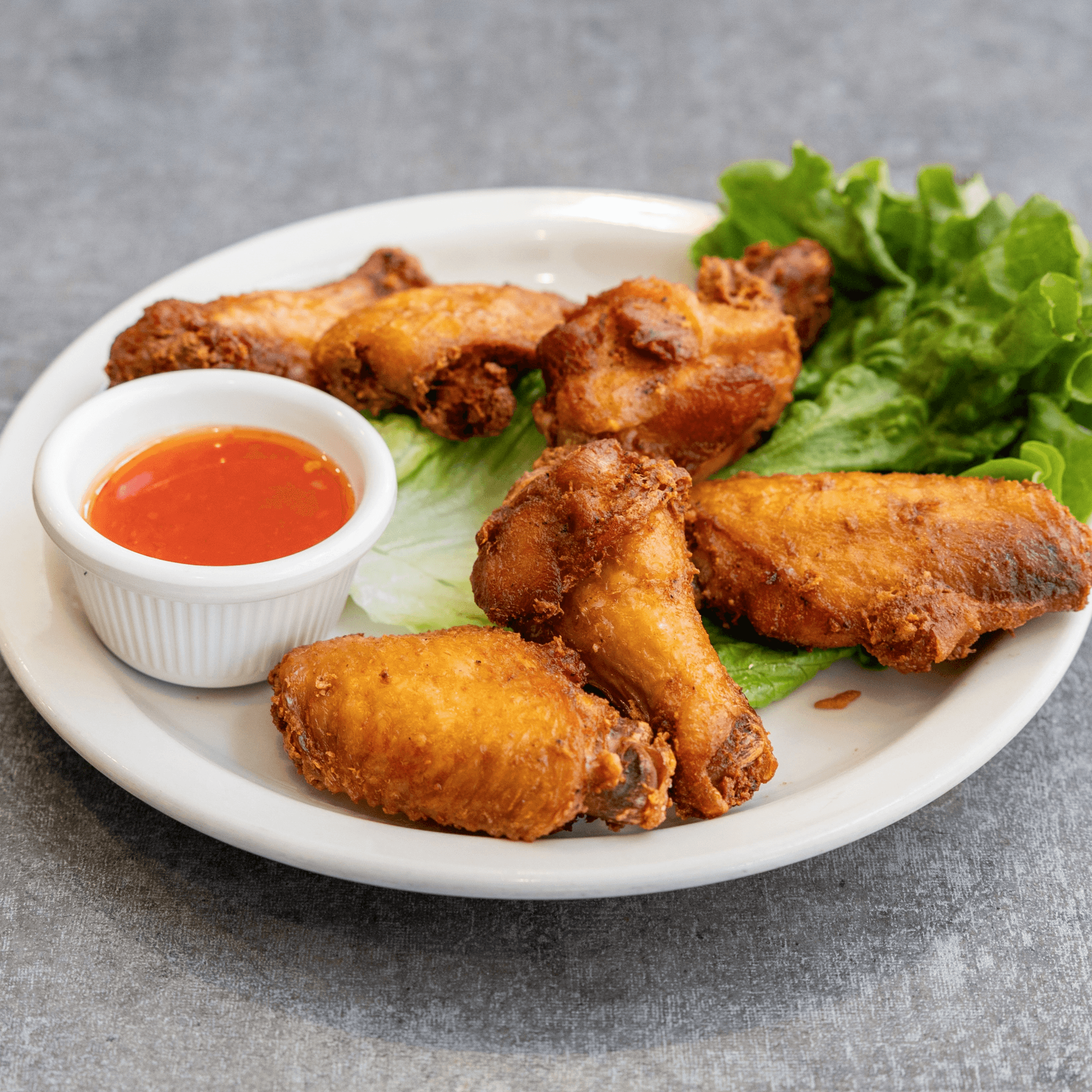 Cánh gà. 6 pieces. Gluten-free. Marinated fried chicken wings with sweet chili sauce