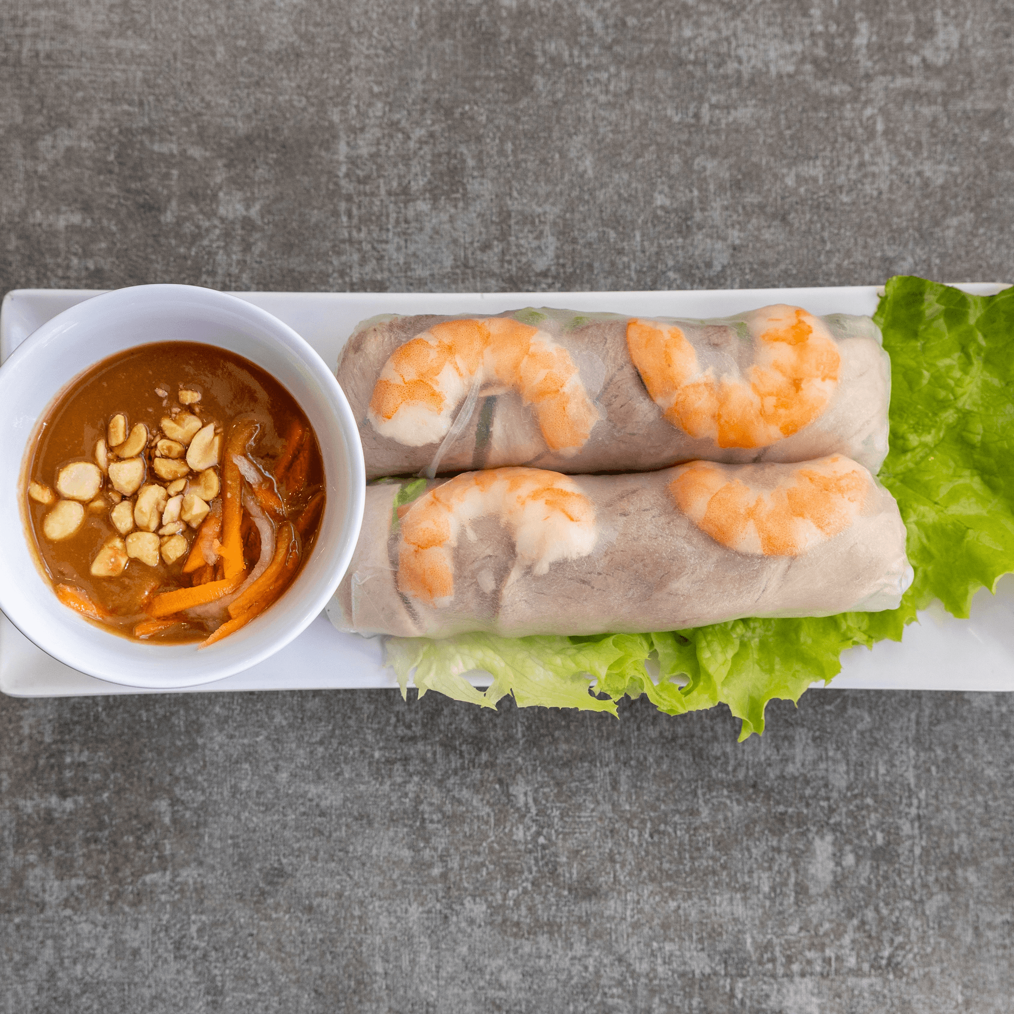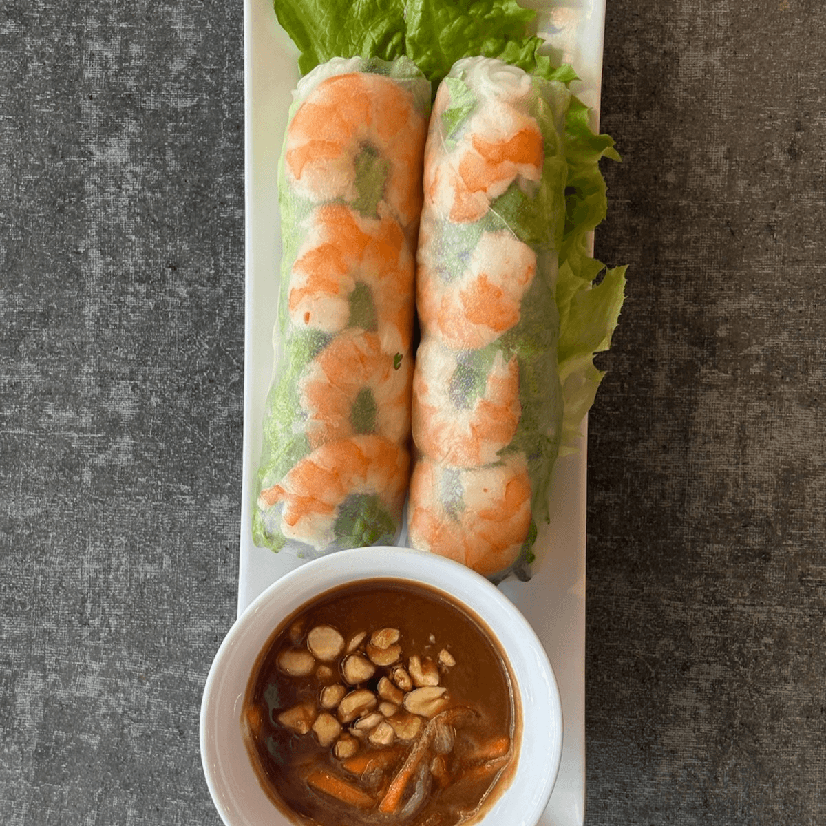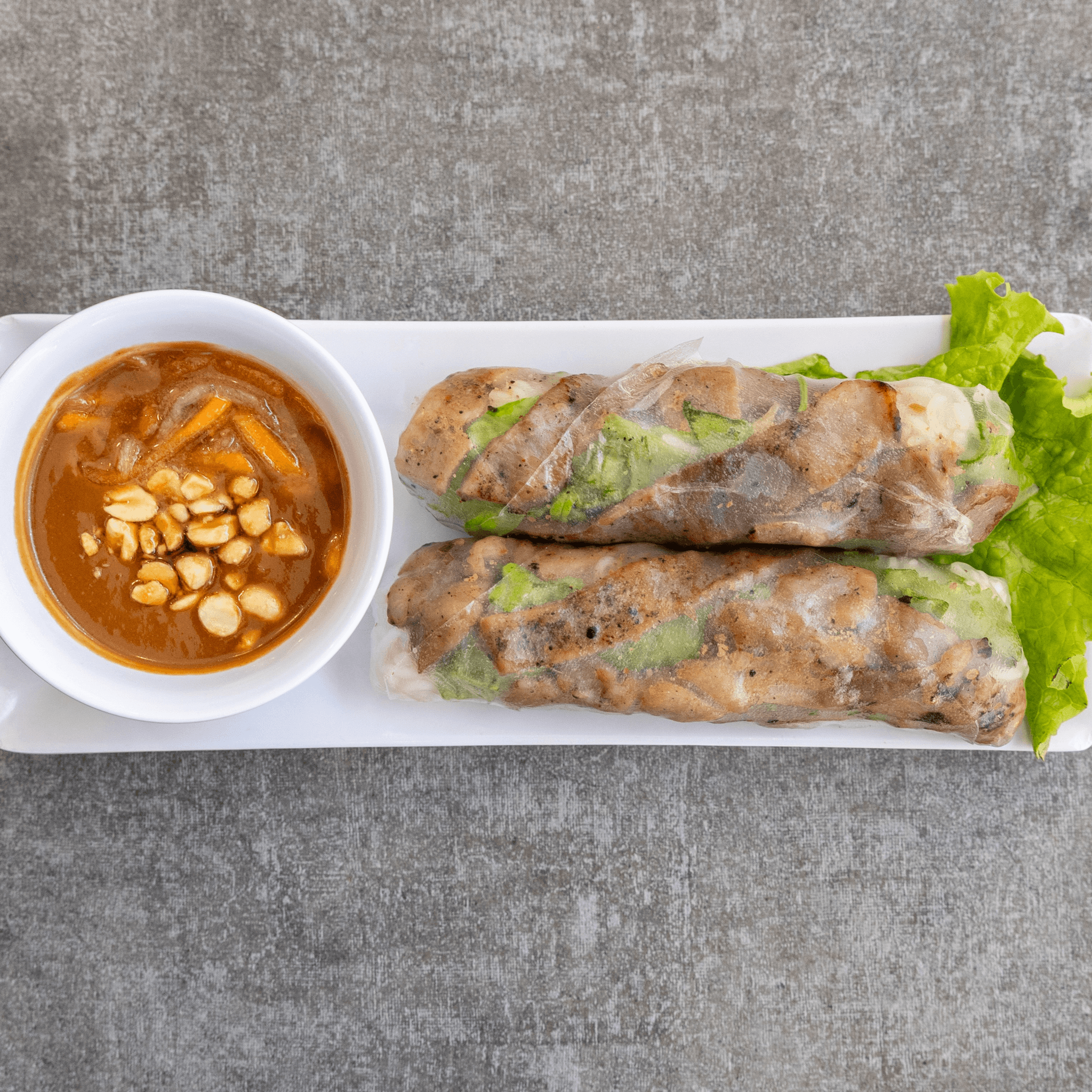 Gỏi cuốn tôm nướng. 2 rolls. Grilled shrimp, fresh lettuce, cilantro, vermicelli rice noodle, wrapped in rice paper. Served with homemade peanut sauce