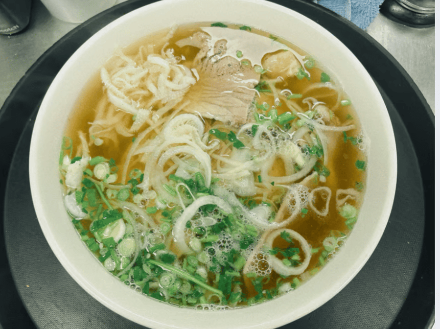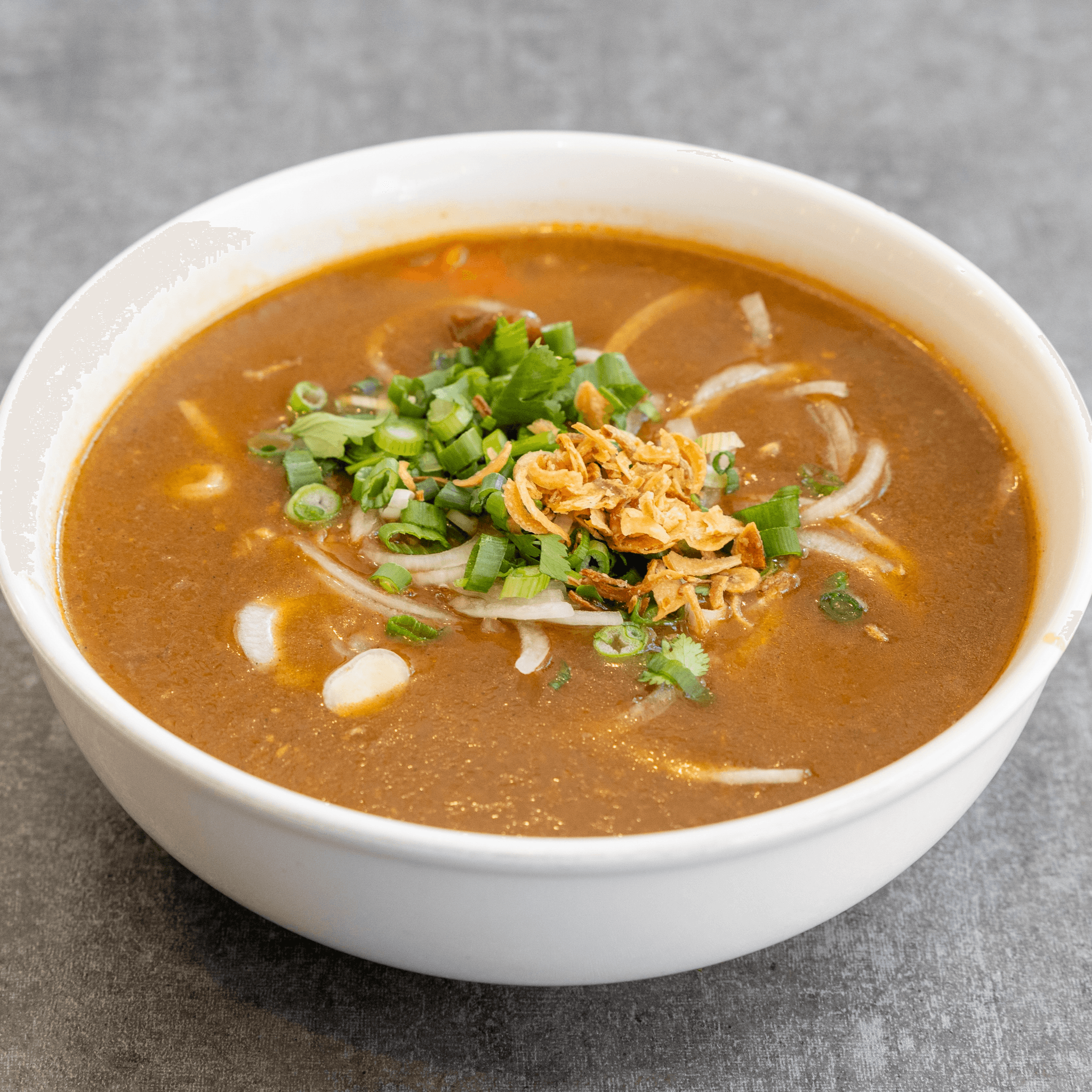 Chín. tender slices of well-done brisket in a noodle soup, available in medium or large sizes