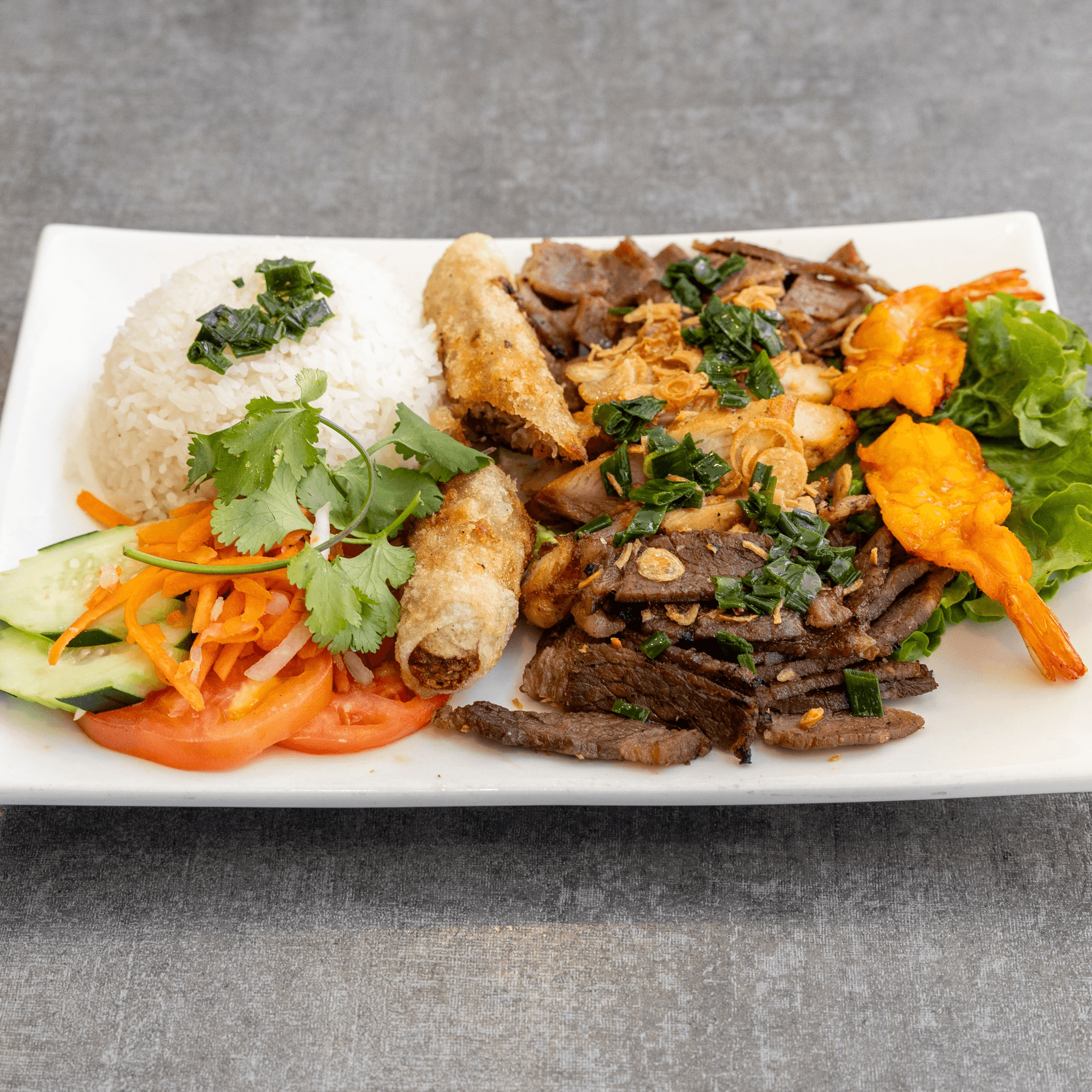 Cơm Đặc Biệt. Grilled beef, pork, chicken, shrimp and egg roll