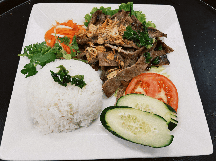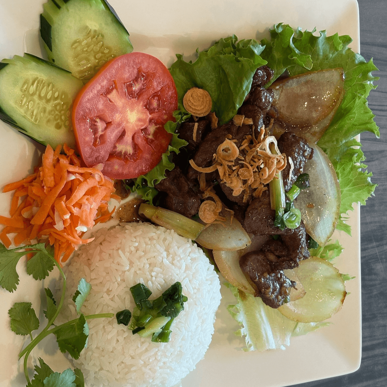Cơm Bò Lúc Lắc. Tender beef cubes sautéed with onions, served with steamed rice, fresh cucumber, pickled carrots, tomatoes, and garnished with green onions and cilantro