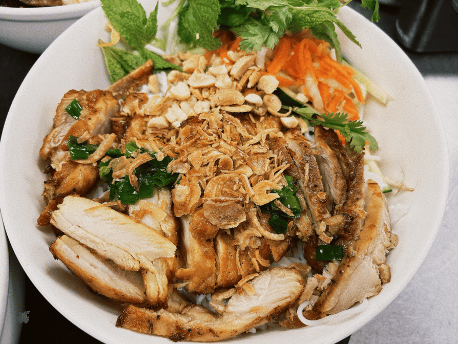 Bún Gà Nướng. Sliced grilled chicken served with vermicelli noodles, fresh lettuce, cucumbers, bean sprouts, and mint. Comes with a side of crushed peanuts and dipping sauce