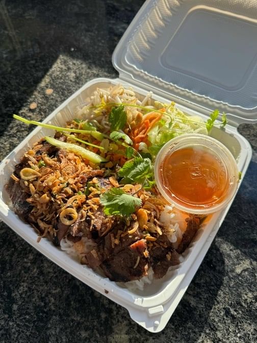 Cơm Bò Nướng. Tender grilled beef served with steamed rice, fresh vegetables, and a tangy dipping sauce