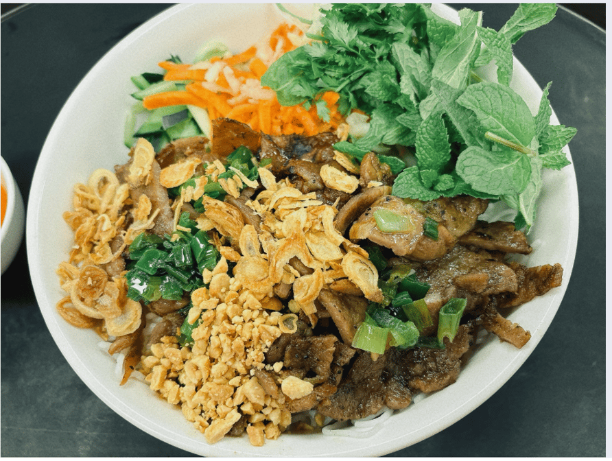 Bùn Heo Nướng. Sliced grilled pork served with fresh herbs, crunchy peanuts, and vermicelli rice noodles. Mix with fish sauce for added flavor