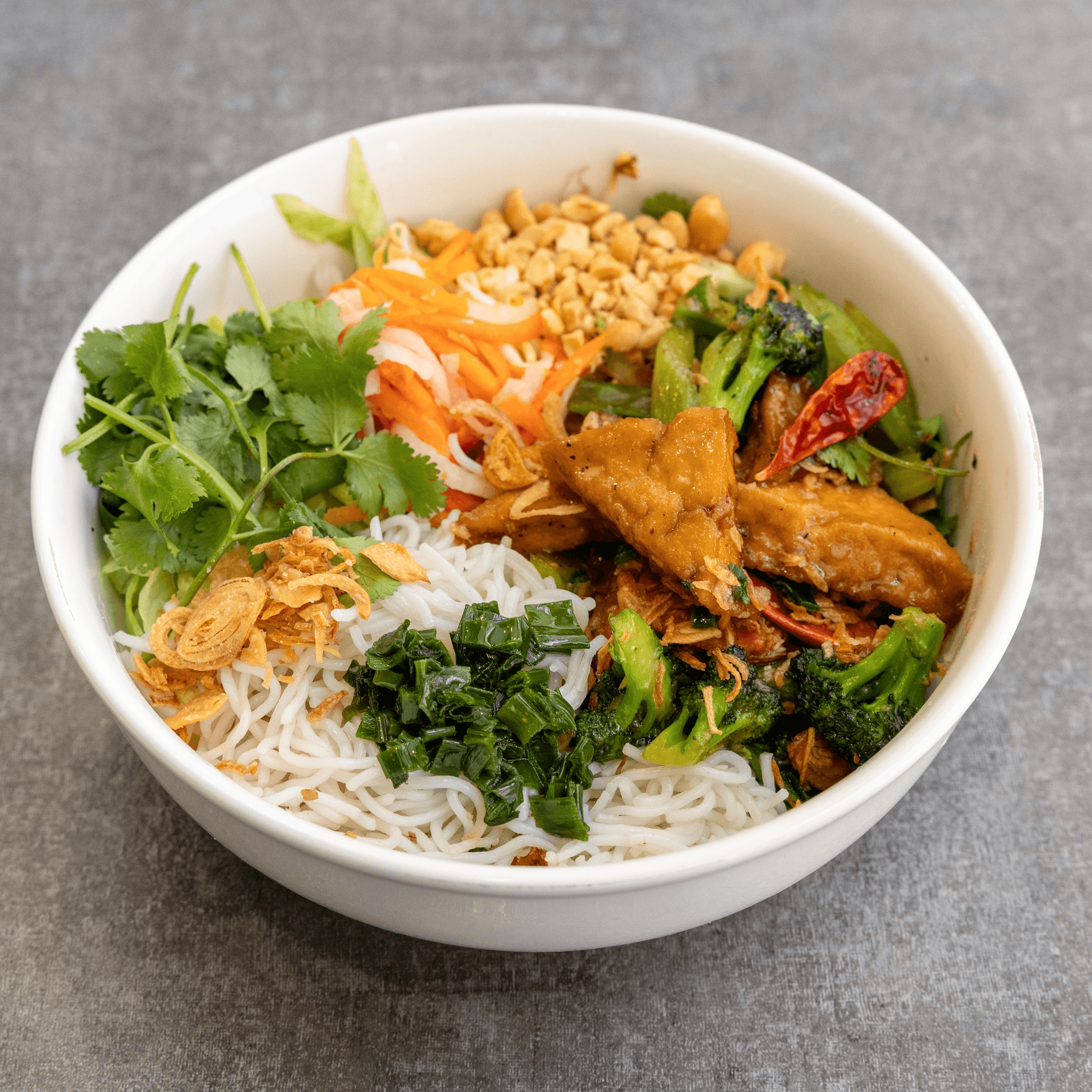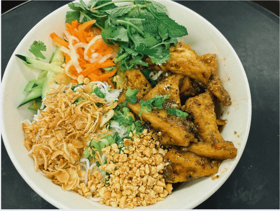 Bún Đậu Hũ Sả Ớt. Tofu infused with lemongrass, served with rice noodles, fresh herbs, and pickled vegetables