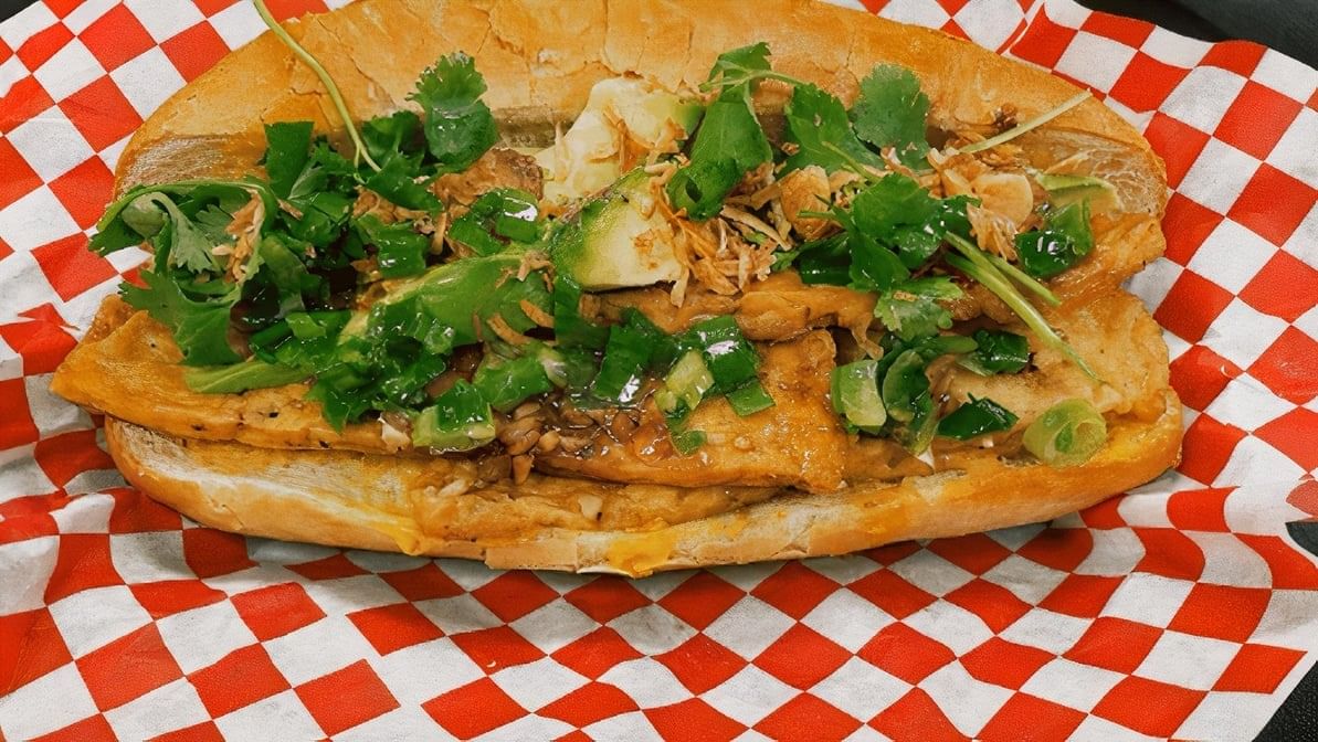 Bánh Mì Đậu Hũ Bơ. Crisp baguette filled with sautéed tofu, creamy avocado, pickled vegetables, cilantro, and jalapenos