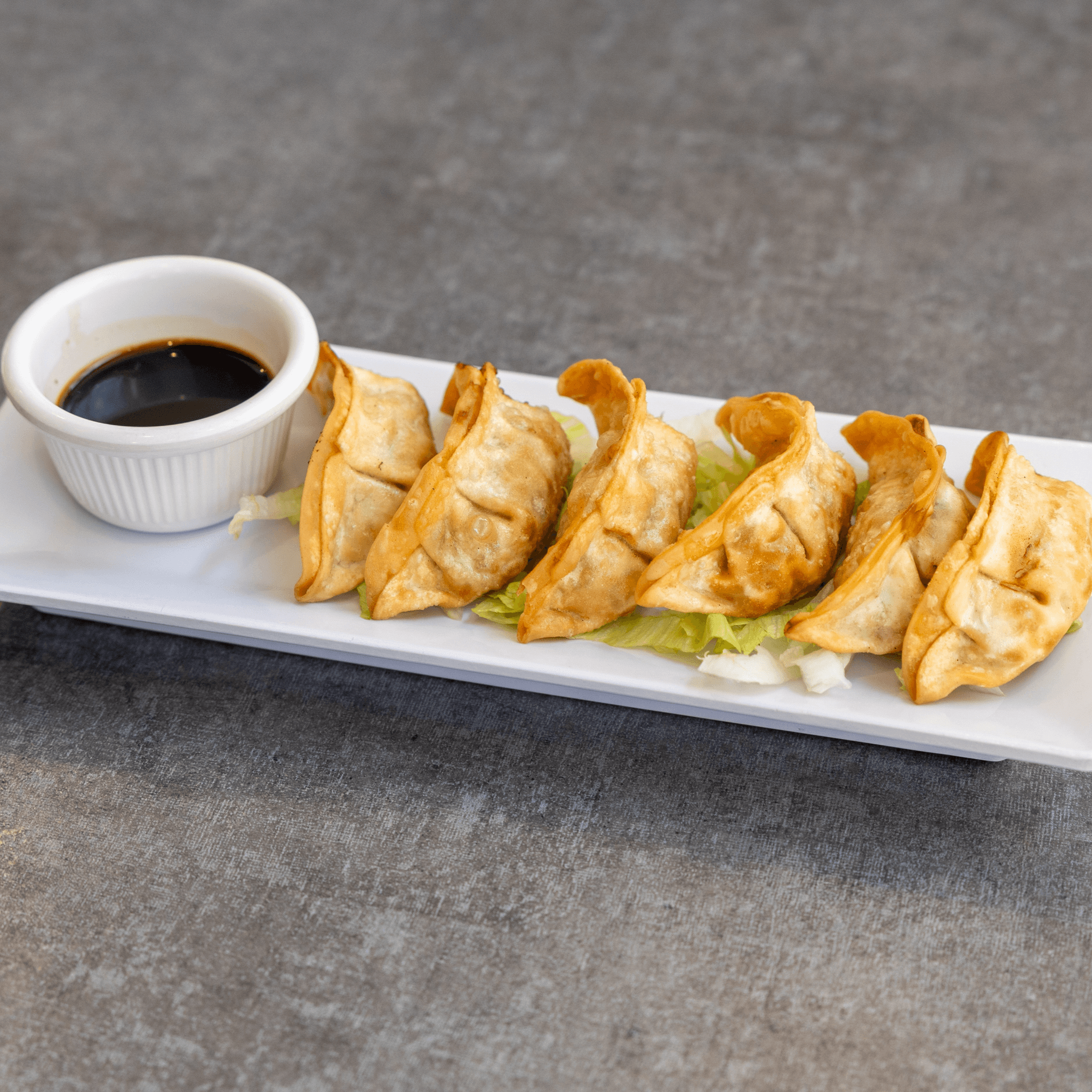 Fried or steamed. 6 pieces. Pork dumplings served with ginger sauce