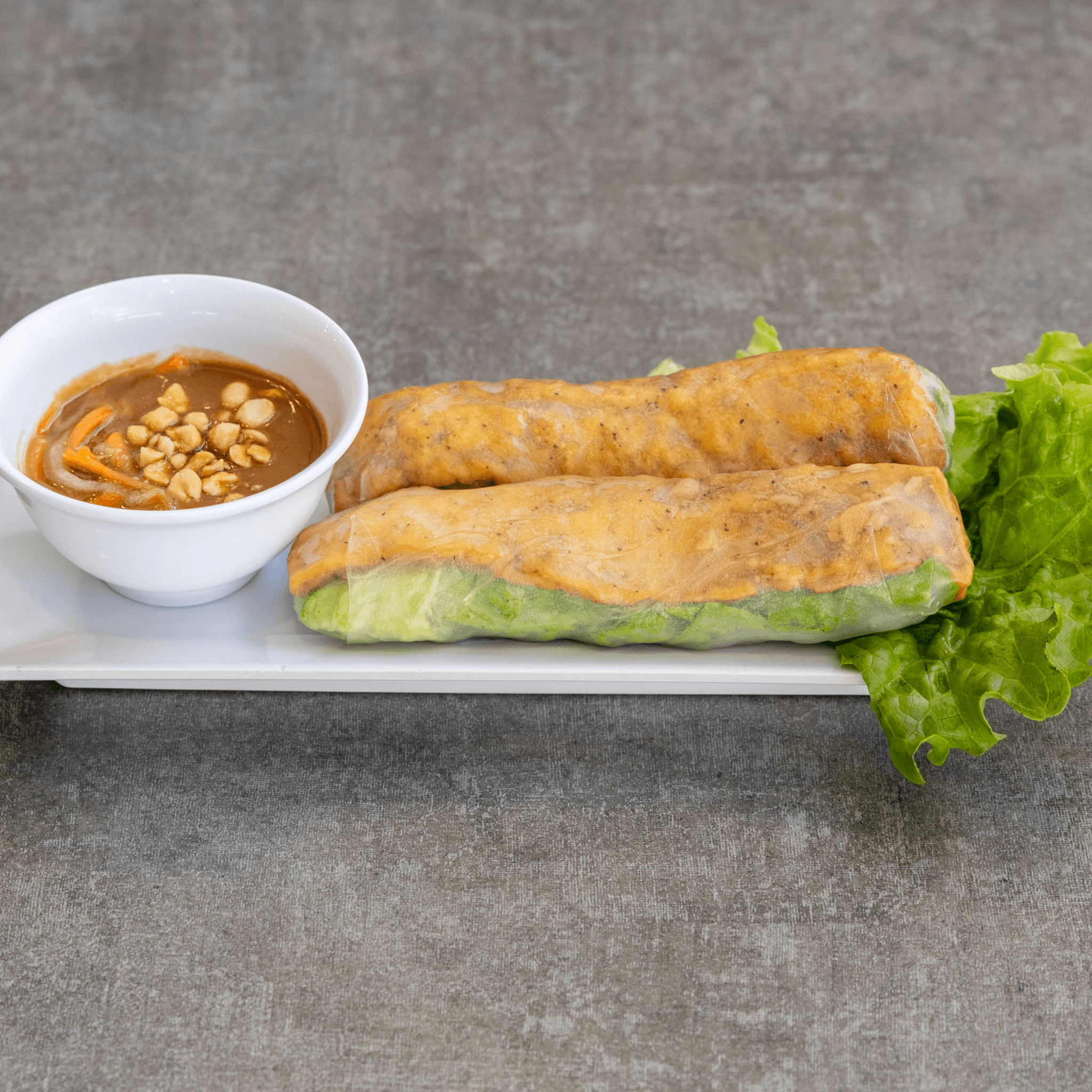 Goi cuốn chay. 2 rolls. Sautéed tofu, fresh lettuce, cilantro, vermicelli rice noodle wrapped in rice paper. Served with homemade peanut sauce