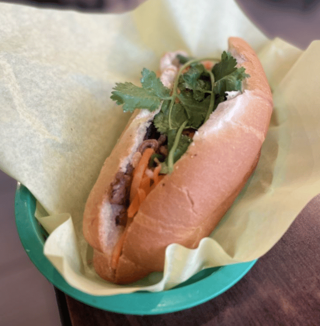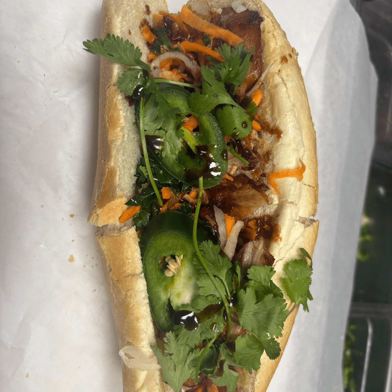Bánh Mì Heo Nướng. Savory grilled pork with fresh cilantro, pickled carrots, daikon radish, cucumbers, and jalapeños on a baguette