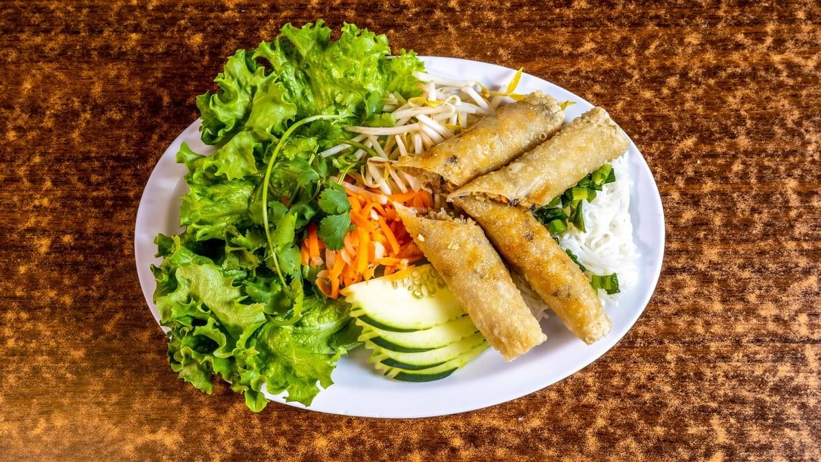 Crispy egg rolls with a mix of fresh lettuce, bean sprouts, shredded carrots, cucumber slices, and cilantro