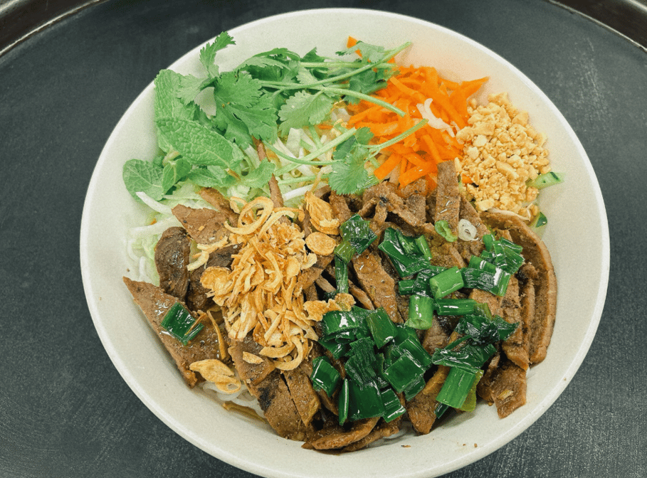 Bún Bò Nướng. Tender grilled beef paired with fresh herbs, crispy vegetables, and rice noodles