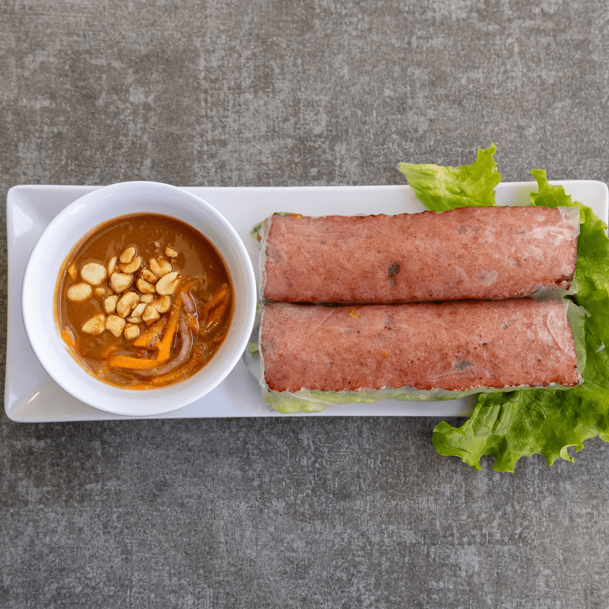 Gỏi cuốn nem nướng. 2 rolls. Grilled pork sausage, crunchy wrap, fresh lettuce, cilantro, cucumber, shredded pickled carrot & daikon wrapped in rice paper. Served with homemade peanut sauce or lime fish sauce