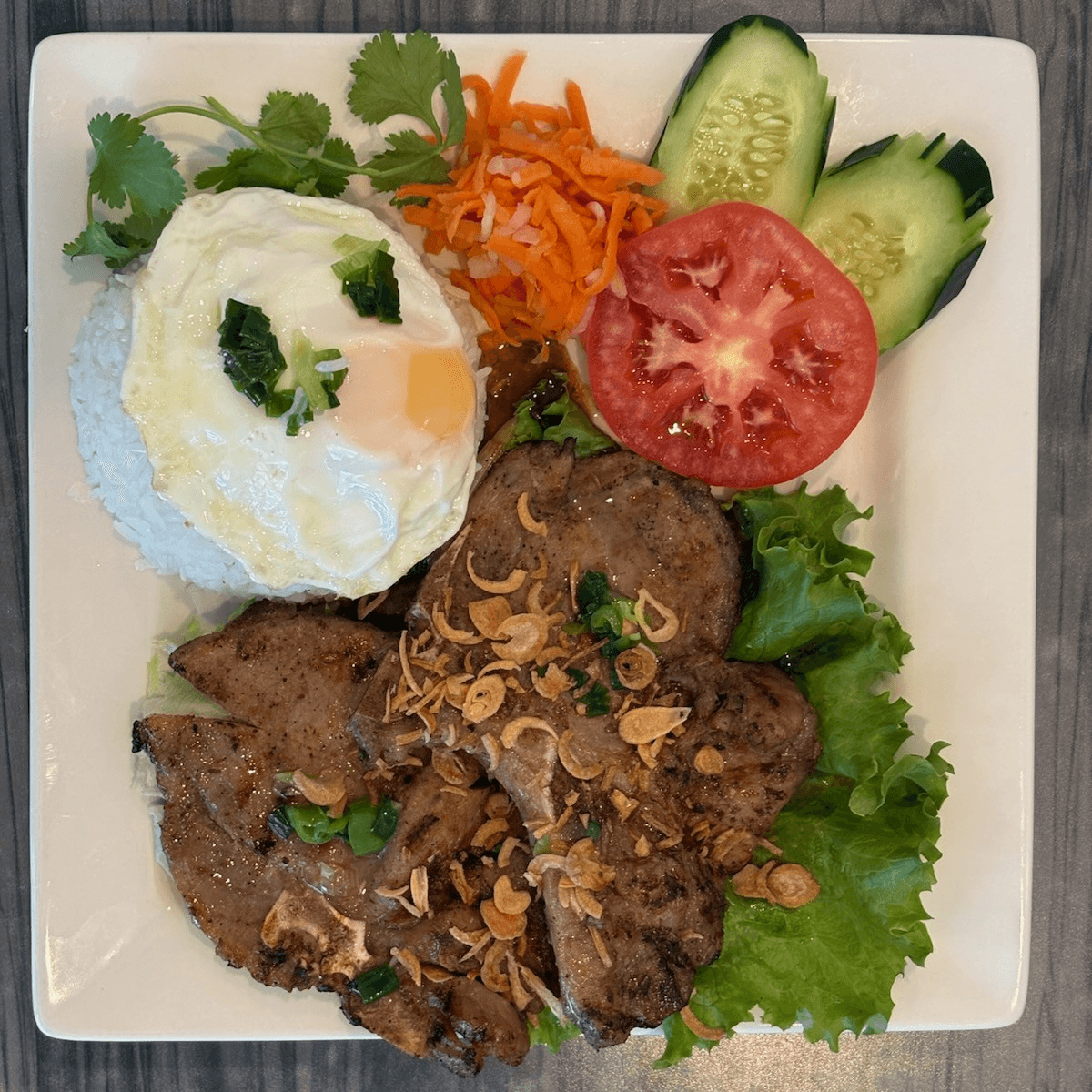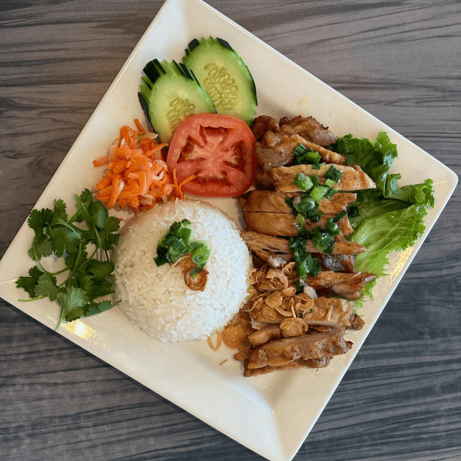 Cơm Gà Nướng. Tender grilled chicken with steamed rice and fresh vegetables
