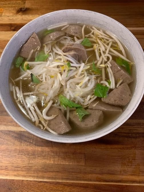 Bò Viên. Tender beef meatballs, rice noodles, bean sprouts, and fresh herbs in a savory broth. Options: medium, large