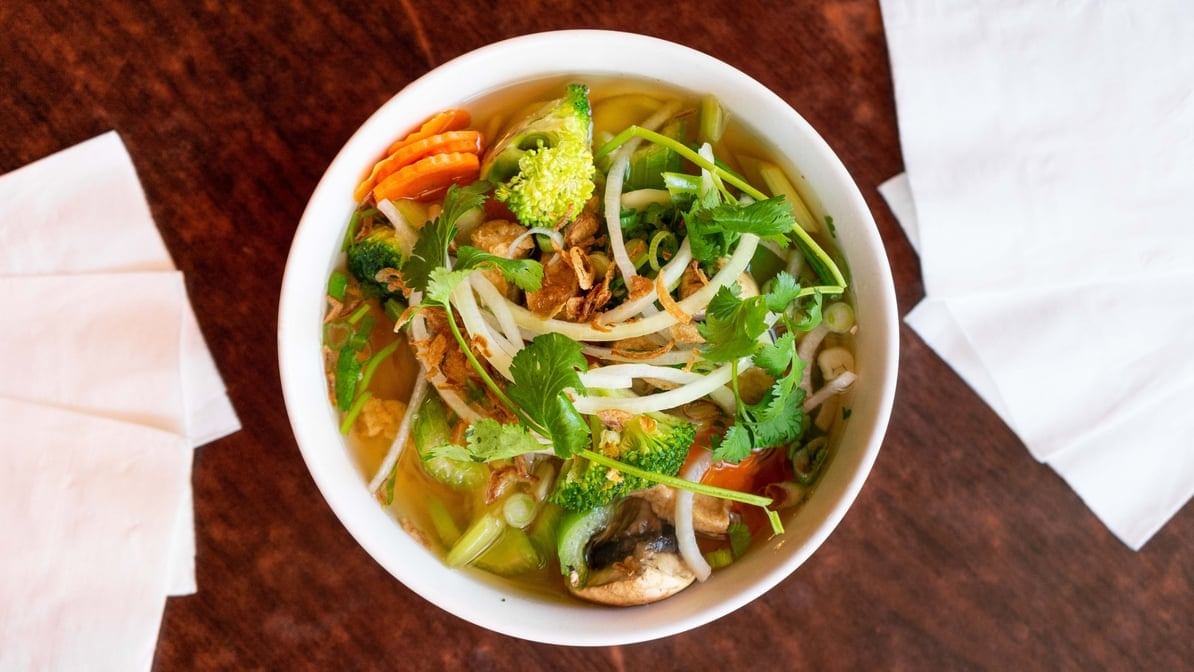 Fresh vegetables and tofu in a savory broth with noodles, topped with bean sprouts, cilantro, and green onions. Available in medium or large